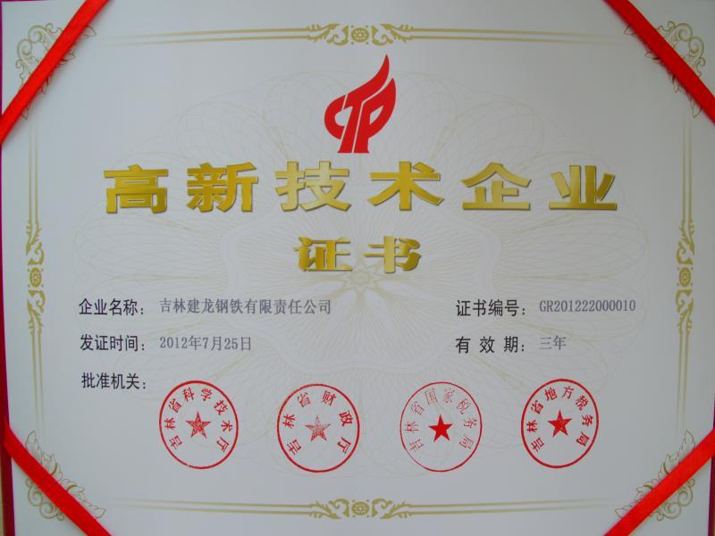 根据《高新技术企业认定管理办法》(国科发[2008]172号)、《高新技术企业认定管理工作指引》(国科发[2008]362号),经专家评审,吉林省高新技术企业认定管理工作办公室、吉林省财政厅、吉林省国家税务局、吉林省地方税务局审查核定,国家高新技术企业认定管理工作领导小组办公室复核。吉林建龙钢铁有限责任公司以95.40分顺利通过认定,荣获“吉林省高新技术企业”荣誉称号,此项殊荣的获得依照《企业所得税法》及相关法律,可享受税收减免政策,同时增强了企业的技术创新能力。