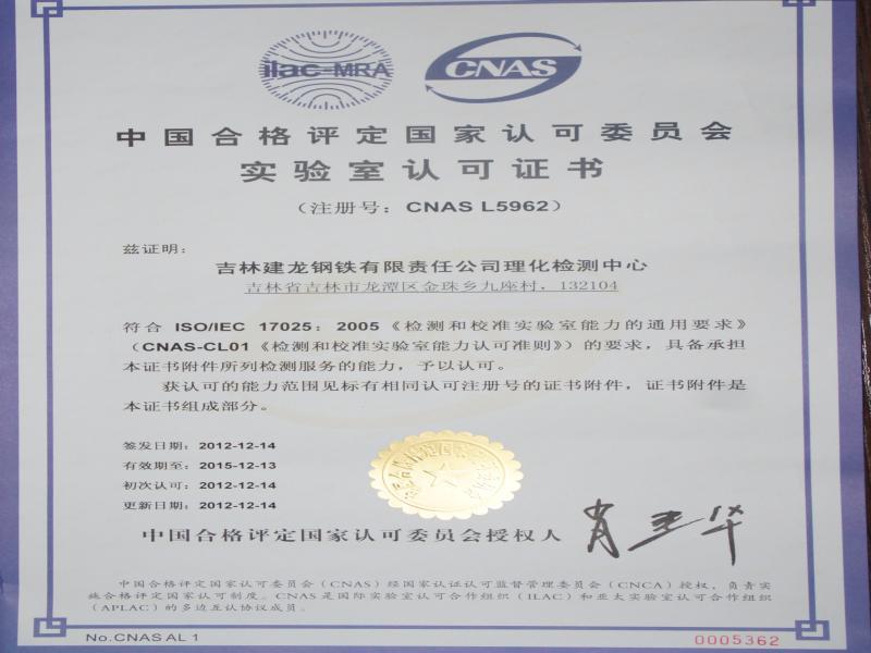 经中国合格评定国家认可委员会(CNAS)的审核评定,吉林建龙钢铁理化检测中心顺利通过国家实验室认可,近日获得了认可委颁发的实验室认可证书,并获准使用CNAS认可标识。